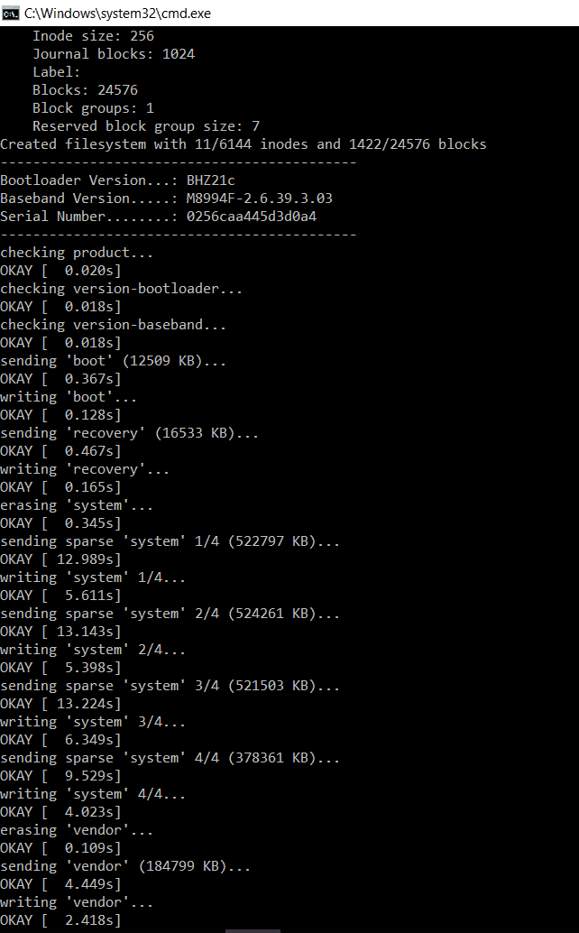 You can flash the system image at once by double clicking the “flash-all.bat” file. [This script installs the necessary bootloader, baseband firmware(s), and operating system.]